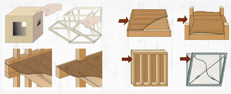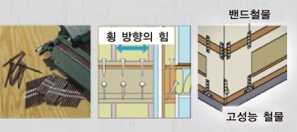 겹쳐진 판에 2개의 못을 치는 것만으로, 그 판을 옆으로 어긋나게 하는 것은 매우 힘듭니다. 이렇게 못은 횡방향(전단력)에 대해서 강한 힘을 발휘.그리고 독자적인 철물에 의해 긴밀하겨 연결된 구조 몸체는 횡단력 뿐만 아니라 종단력에 대해서도 뛰어난 내구성을 갖추게 됩니다.
