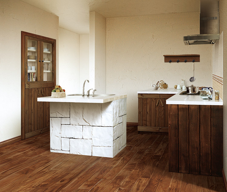 요리를 통해 가족의 커뮤니케이션을 즐기는 공간으로, 개성적 형태의 주방은, 하나하나 수제작한 본격 아일랜드 키친에서 가족이나 지인을 초대해 다이닝 파티를 즐긴다. 디자인에 대한 고집, 소재에 대한 고집으로 동경하던 주방의 형태를 완성. 자연 소재이기 때문에 소박한 온기도 느껴집니다.