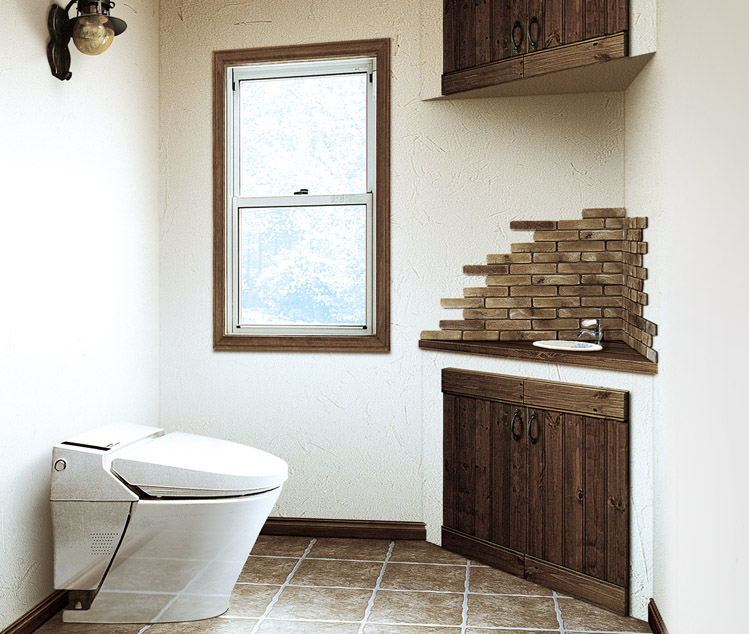 창문에 앤틱한 조명. 코너를 이용한 편리한 화장실 세니터리. 천연재료와 세로공간을 잘 활용하여 앤틱 모던의 화장실 연출.세니터리 공간은 원목재와 브릭타일의 질리지 않는 앤틱공간이 차분한 느낌을 연출합니다.