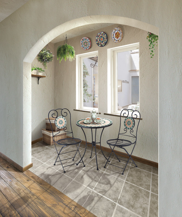 현관, 키친에서도 연결되는 푸른 하늘 아래의 거실 [파티오]. 언제나 생활의 중심에는 이 파티오가 있다. 해가 얼굴을 내비치거나,비가 내리기도 하는 이곳은, 토분에 작은 이끼가 끼거나 아이언 의자의 청녹도 조금씩 더해간다. 하지만 이러한 모습이 사랑스럽다.10년 후, 한층 더 각이 둥글고 상냥한 표정이 되어 간다. 이 파티오에서의 시간은 가족을 키워 나간다.